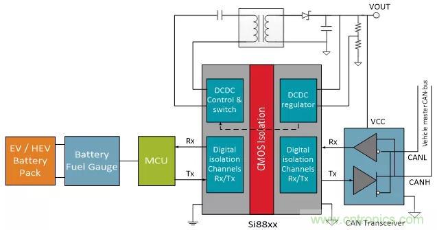 如圖3所示,這個簡化的BMS系統(tǒng)展示了在與一個EV子系統(tǒng)進(jìn)行連接時信號和電源隔離的重要性。在大多數(shù)EV子系統(tǒng)中,CAN總線通過數(shù)字隔離與該子系統(tǒng)中的高壓隔離?,F(xiàn)代數(shù)字隔離兩側(cè)各需要一個電源為隔離器供電(高壓域和低壓域)。該電源也可為連接到隔離器的其他設(shè)備供電,例如CAN總線收發(fā)器。