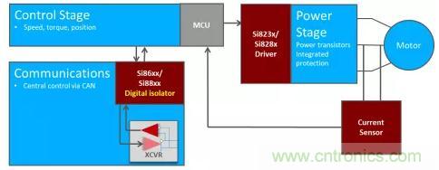 這些系統(tǒng)需要在馬達(dá)控制器和功率晶體管之間采用隔離驅(qū)動器。隔離允許低壓控制器安全地開關(guān)高功率晶體管以產(chǎn)生交流波形。此外,馬達(dá)控制系統(tǒng)中可能存在隔離的CAN總線,并且有某些方法可以感測驅(qū)動馬達(dá)的電流,以監(jiān)控速度和轉(zhuǎn)矩。圖4展示了一個使用一系列數(shù)字隔離設(shè)備的簡化的牽引馬達(dá)控制系統(tǒng)。