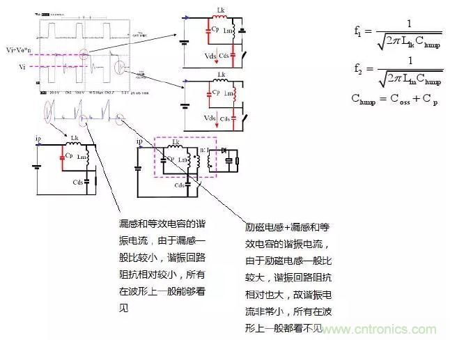 f1比f2大很多(從波形上可以看出),這是由于漏感一般相對較小;同時由于f1所在回路阻抗比較小,諧振電流較大,所以能夠很快消耗在等效電阻上,這也就是為什么f1所在回路很快就諧振結束的原因?。ň唧w諧振時間可以通過等效模型求解:二次微分方程估算)