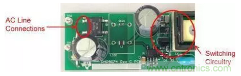 注意,漏極連接與輸入引線之間有一些由輸入電容器提供的屏蔽。該電容器的外殼連接至主接地,可為共模電流提供返回主接地的路徑。如圖2所示,這個微小的電容會導(dǎo)致電源EMI簽名超出規(guī)范要求。