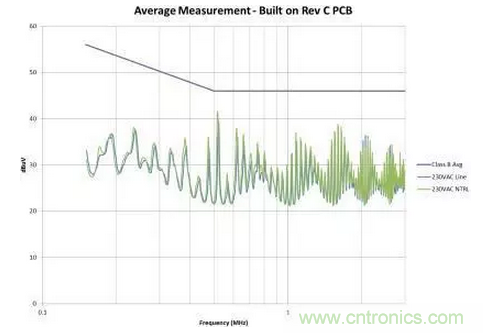 圖4是修改后的效果圖。我們在故障點(diǎn)位置為EMI規(guī)范獲得了大約6dB的裕量。此外,我們還顯著減少了總體EMI簽名。所有這些改善都僅僅是因為布局的調(diào)整,并未改變電路。如果您的電路具有高電壓開關(guān)并使用了屏蔽距離,您需要非常小心地對其進(jìn)行控制。