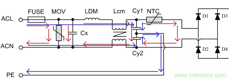 對ACL與ACN之間施加的浪涌電壓稱為差模浪涌電壓,差模路徑如圖中紅線所示;對ACL(或ACN)與PE之間施加的電壓稱為共模浪涌電壓,共模路徑如圖中藍(lán)線所示。