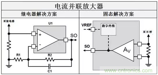 繼電器解決方案需要單獨(dú)的分立放大器電路來增加在檢測(cè)電阻上測(cè)量的電壓。