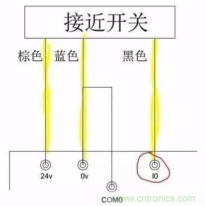 如圖三所示,這是PLC 的實際接線,黃色熒光筆標識的是接近開關(guān)的三根接線,棕色和藍色分別接到PLC 的24V和0V上,黑色接到I0上。當有物體到達接近開關(guān)的感應(yīng)距離時,PLC的I0便會有輸入,我們在程序里就可以做處理。需要注意的是,圖中0V和COM0短接,因此,這種接法適合PNP型的接近開關(guān)。而NPN型的接近開關(guān)按此接法,是不會有任何信號的。接近開關(guān)的接線只和NPN,PNP類型有關(guān)和感性 容性無任何關(guān)系。
