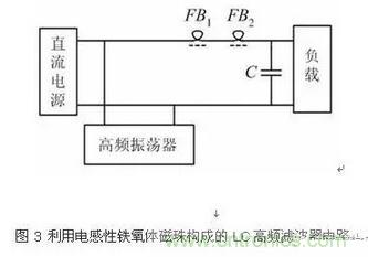 由于鐵氧體磁珠在電路中使用能夠增加高頻損耗而又不引入直流損耗,而且體積小、便于安裝在區(qū)間的引線或者導(dǎo)線上,對于1MHz以上的噪聲信號抑制效果十分明顯,因此可用作高頻電路的去耦、濾波以及寄生振蕩的抑制等。特別對消除電路內(nèi)部由開關(guān)器件引起的電流突變和濾波電源線或其它導(dǎo)線引入電路的高頻噪聲干擾效果明顯。低阻抗的供電回路、諧振電路、丙類功率放大器以及可控硅開關(guān)電路等,使用鐵氧體磁珠進(jìn)行濾波都是十分有效的。鐵氧體磁珠一般可以分為電阻性和電感性兩類,使用時可以根據(jù)需要選取。單個磁珠的阻抗一般為十至幾百歐姆,應(yīng)用時如果一個衰減量不夠時可以用多個磁珠串聯(lián)使用,但是通常三個以上時效果就不會再明顯增加了[7]。如圖3示出了利用兩只電感性鐵氧體磁珠構(gòu)成的高頻LC濾波器電路,該電路可有效的吸收由高頻振蕩器產(chǎn)生的振蕩信號而不致竄入負(fù)載,并且不降低負(fù)載上的直流電壓。