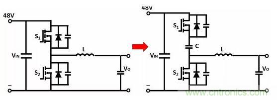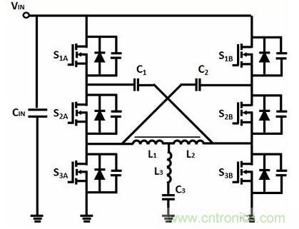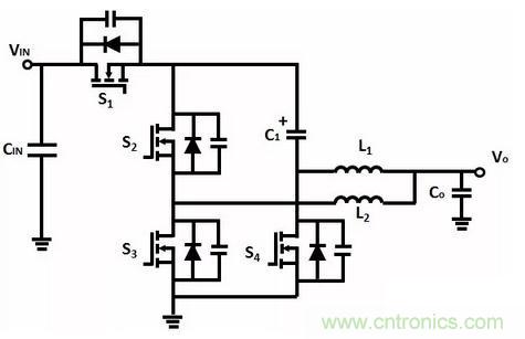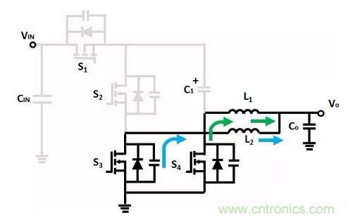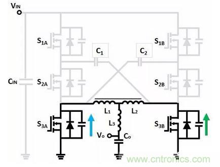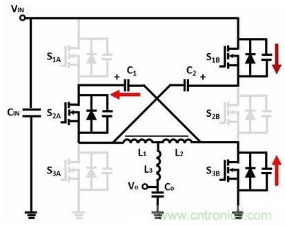 如果C1、C2的電容相等,電感電流等于電容C1、C2的電流之和。S1、S3工作于硬開(kāi)關(guān)狀態(tài),由于S1、S3的電流降低,因此可以同時(shí)降低導(dǎo)通損耗和開(kāi)關(guān)損耗。