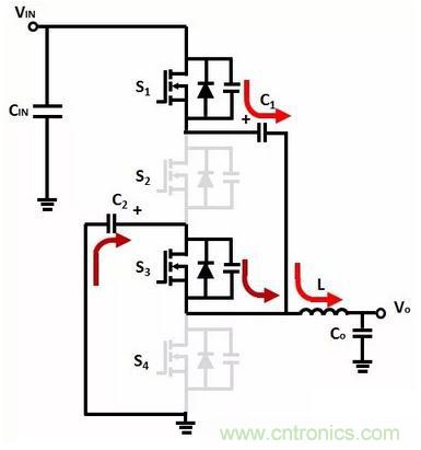 L1激磁,輸入電壓通過(guò)C1向輸出負(fù)載提供能量,同時(shí)對(duì)C1充電; L2去磁,S4續(xù)流。