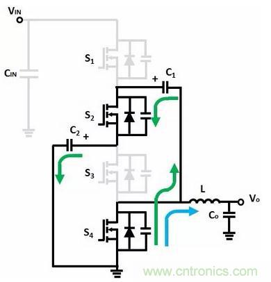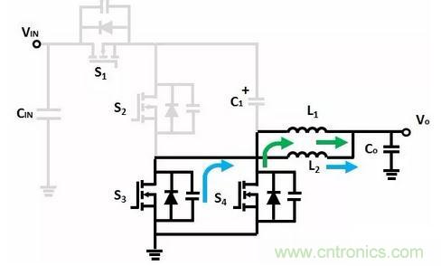 L2激磁,電容C1放電,通過(guò)L2向輸出負(fù)載提供能量; L1去磁,S4續(xù)流。