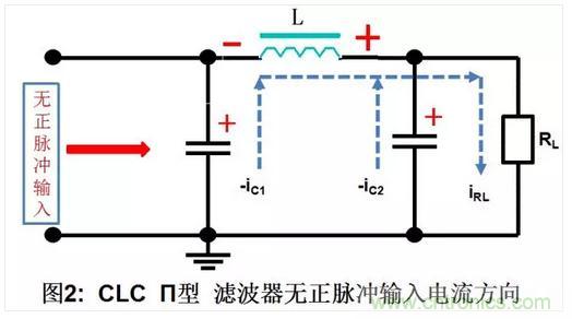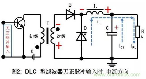 b. 輸入正脈沖消失,負載RL的電流由兩路提供,一路是C2放電提供的電流為-ic2,,另一路是由電感L儲存的磁能轉(zhuǎn)換成電能,并與C1上的電壓串聯(lián)后提供-ic1。負載RL中的電流等于兩個電容器放電電流的和,即IL= -(ic2+ic1)