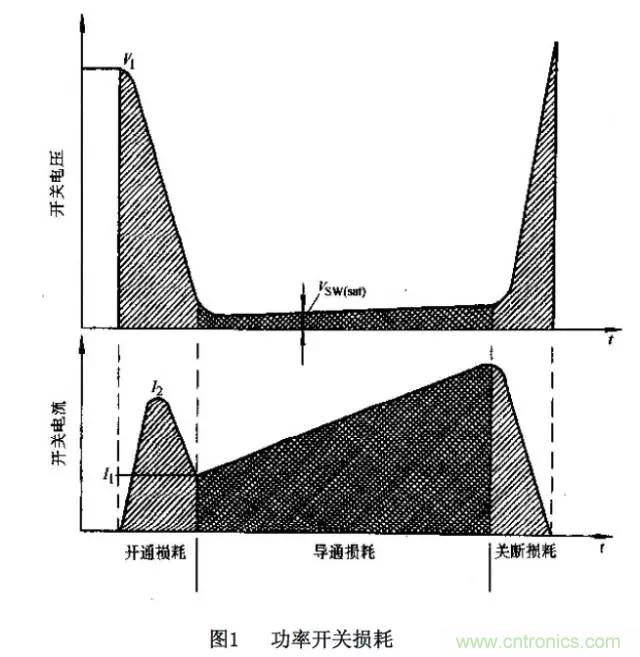 功率開關是典型的開關電源內部最主要的兩個損耗源之一。損耗基本上可分為兩部分:導通損耗和開關損耗。導通損耗是當功率器件已被開通,且驅動和開關波形已經(jīng)穩(wěn)定以后,功率開關處于導通狀態(tài)時的損耗;開關損耗是出現(xiàn)在功率開關被驅動,進入一個新的工作狀態(tài),驅動和開關波形處于過渡過程時的損耗。這些階段和它們的波形見圖1。