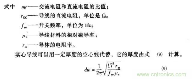 電阻損耗是變壓器或電感內部繞組的電阻產(chǎn)生的損耗。有兩種形式的電阻損耗:直流電阻損耗和集膚效應電阻損耗。直流電阻損耗由繞組導線的電阻與流過的電流有效值二次方的乘積所決定。集膚效應是由于在導線內強交流電磁場作用下,導線中心的電流被“推向”導線表面而使導線的電阻實際增加所致,電流在更小的截面中流動使導線的有效直徑顯得小了。式(8)給出了這兩個損耗在一個表達式中的計算式。