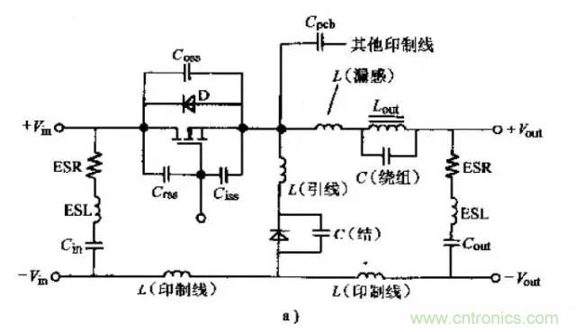 寄生參數(shù)是電路內部實際元件無法預料的電氣特性,它們一般會儲存能量,并對自身元件起反作用而產(chǎn)生噪聲和損耗。對設計者來說,分辨、定量、減小或利用這些反作用是一個很大的挑戰(zhàn)。在交流情況下,寄生特性更加明顯。典型的開關電源內部有兩個主要的、存在較大交流值的節(jié)點,第一是功率開關的集電極或漏極;第二是輸出整流器的陽極。必須重點關注這兩個特殊的節(jié)點。