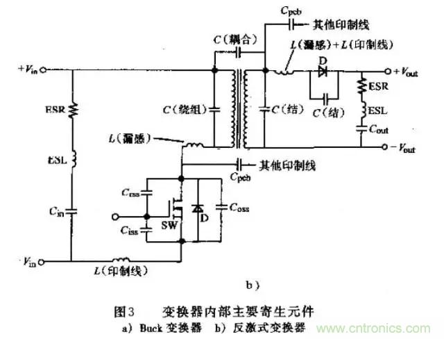 在所有開關電源中,有一些常見的寄生參數(shù),在觀察變換器內主要交流節(jié)點的波形時,可以明顯看到它們的影響。有些器件的數(shù)據(jù)資料中,甚至給出了這些參數(shù),如MOSFET的寄生電容。兩種常見變換器的主要寄生參數(shù)見圖3。