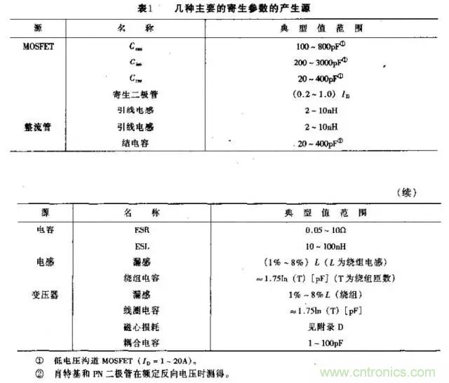 有些寄生參數(shù)已明確定義,如MOSFET的電容,其他一些離散的寄生參數(shù)可以用集中參數(shù)表示,使建模變得更加容易。試圖確定那些沒有明確定義的寄生參數(shù)的值是非常困難的,通常用一個經(jīng)驗值確定,換句話說,在進行軟開關設計時,元器件的選擇以能得到最佳結果為原則來進行。在線路圖中,合適的地方放置寄生元件非常重要,因為電氣支路只在變換器工作的一部分時間內起作用。例如,整流器的結電容只有在整流器反向偏置時會很大,而當二極管正向偏置時就消失了。表l列出了一些容易確定的寄生參數(shù)和產(chǎn)生這些參數(shù)的元器件,以及這些值的大致范圍。某些特殊的寄生參數(shù)值可以從特定元器件的數(shù)據(jù)資料中獲得。