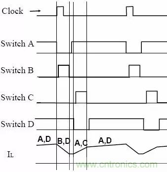 當(dāng)輸入電壓比輸出電壓高△V時,開關(guān)管D保持常開,開關(guān)管C保持常關(guān),開關(guān)管A和B工作于同步的Buck模式。其工作原理與一般的同步的Buck工作原理完全相同,控制的方法為谷點電流模式,如圖2所示,其中D為占空比。