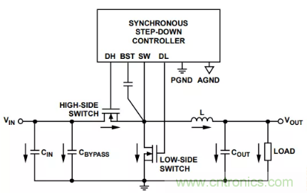 圖1所示為一個同步降壓調(diào)節(jié)器設(shè)計,它包括一個開關(guān)控制器和以下外部電源器件:高端開關(guān)、低端開關(guān)、電感、輸入電容、輸出電容和旁路電容。圖1中的箭頭表示高開關(guān)電流流向。必須小心放置這些電源器件,避免產(chǎn)生不良的寄生電容和電感,導(dǎo)致過大噪聲、過沖、響鈴振蕩和接地反彈。