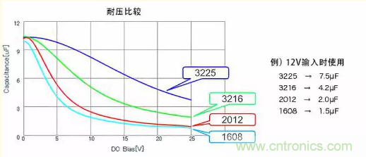 關(guān)于DC偏置,當(dāng)然須選擇影響少的,不過即使電容值、耐壓相同,變動特性也會因封裝尺寸而異。下方圖表為其一例,顯示尺寸大者變動少。總之,請務(wù)必從電容器廠商取得充分的信息。
