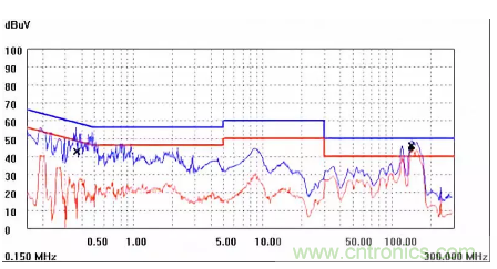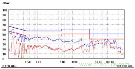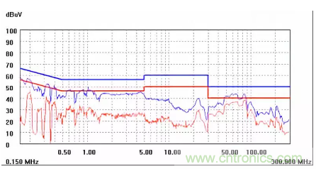 圖一a可以看出,改變PCB布局后130M-200M已經(jīng)完全被衰減,但是30-130M沒(méi)有圖一效果好,可能變壓器出線無(wú)交叉好一些。仔細(xì)觀察,此IC具有抖頻功能,傳導(dǎo)部分頻段削掉了一些尖峰;