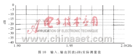 得到了完整的電路PCB板后,就要實際測量電路的各個參數(shù),驗證設(shè)計的仿真結(jié)果是否與之相符,是否最終符合表1的設(shè)計技術(shù)規(guī)范。本文所采用的測試儀器是HP8753ES網(wǎng)絡(luò)分析儀和HP8970B噪聲儀。圖8、圖9表達出放大器實測的NF和增益曲線,在帶寬為0.1GHz的頻率范圍內(nèi)NF的值在0.8dB和1.0dB之間,增益在1.97GHz達到最大值15.5dB,在1.99GHz達到了15.3dB。由于NF是在實際PCB板外腔體內(nèi)測得的,包含了同軸連接器的損耗和二級噪聲損耗,其測量指標表明實際的電路NF特性要稍差于模擬特性。圖10是輸入、輸出的回波曲線。當頻點在1.96GHz時,輸入回波為18dB,輸出回波達到22.5dB,放大器的OIP3在直流偏置Vds=3V,Id=60mA時測得值為37dBm,P1dB為21.4dBm。電路在較低的偏置狀態(tài)下Vds=3V,Id=40mA放大器的NF和增益都沒有降低,只有OIP3測出下降為36.5dBm。
