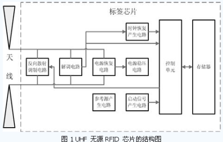 如圖1 所示,一個(gè)完整超高頻無(wú)源RFID 標(biāo)簽由天線和標(biāo)簽芯片兩部分組成,其中,標(biāo)簽芯片一般包括以下幾部分電路:電源恢復(fù)電路、電源穩(wěn)壓電路、反向散射調(diào)制電路、解調(diào)電路、時(shí)鐘提取/產(chǎn)生電路、啟動(dòng)信號(hào)產(chǎn)生電路、參考源產(chǎn)生電路、控制單元、存儲(chǔ)器。