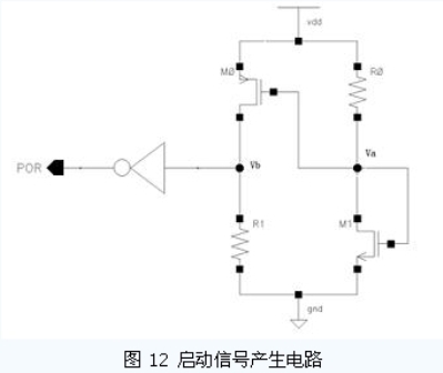 該電路仍然存在的靜態(tài)功耗的問(wèn)題,可以通過(guò)增大電阻值,合理選擇MOS 管尺寸來(lái)降低靜態(tài)功耗的影響。要想完全解決靜態(tài)功耗的問(wèn)題則需要設(shè)計(jì)額外的反饋控制電路,在啟動(dòng)信號(hào)產(chǎn)生后關(guān)斷這部分電路。但是,需要特別注意引入反饋后產(chǎn)生的不穩(wěn)定態(tài)的問(wèn)題。