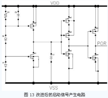 通常,無(wú)源RFID 標(biāo)簽進(jìn)入場(chǎng)區(qū)后,電源電壓上升的時(shí)間并不確定,有可能很長(zhǎng)。這就要求設(shè)計(jì)的啟動(dòng)信號(hào)產(chǎn)生電路產(chǎn)生啟動(dòng)信號(hào)的時(shí)刻與電源電壓相關(guān)。圖12 所示是一種常見(jiàn)的啟動(dòng)信號(hào)產(chǎn)生電路。
