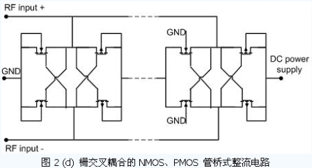 在這些電源恢復(fù)電路中,并不存在最理想的電路結(jié)構(gòu),每種電路都有各自的優(yōu)點(diǎn)及缺陷。在不同的負(fù)載情況、不同的輸入電壓情況、不同的輸出電壓要求以及可用的工藝條件下,需要選擇不同的電路以使其達(dá)到最優(yōu)的性能。圖2(a)所示的多級(jí)二極管倍壓電路,一般采用肖特基勢(shì)壘二極管。它具有倍壓效率高、輸入信號(hào)幅度小的優(yōu)點(diǎn),應(yīng)用十分廣泛。但是,一般代工廠的普通CMOS 工藝不提供肖特基勢(shì)壘二極管,在工藝的選擇上會(huì)給設(shè)計(jì)者帶來(lái)麻煩。圖2(b)是用接成二極管形式的PMOS 管來(lái)代替肖特基二極管,避免了工藝上的特殊要求。這種結(jié)構(gòu)的倍壓電路需要有較高的輸入信號(hào)幅度,在輸出電壓較高時(shí)具有較好倍壓效率。圖2(c)是傳統(tǒng)的二極管全波整流電路。與Dickson 倍壓電路相比,倍壓效果更好,但引入了更多的二極管元件,功率轉(zhuǎn)換效率一般略低于Dickson 倍壓電路。另外,由于它的天線輸入端與芯片地分離,從天線輸入端向芯片看去,是一個(gè)電容隔直的全對(duì)稱(chēng)結(jié)構(gòu),避免了芯片地與天線的相互影響,適合于與對(duì)稱(chēng)天線(例如偶極子天線)相接。圖2(d)是許多文獻(xiàn)提出的全波整流電路的CMOS 管解決方案。在工藝受限的情況下,可以獲得較好的功率轉(zhuǎn)換效率,并且對(duì)輸入信號(hào)幅度的要求也相對(duì)較低。