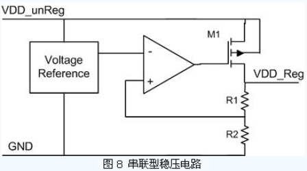 另外一類(lèi)穩(wěn)壓電路的原理則是采用串聯(lián)式的穩(wěn)壓方案。它的原理圖如圖8 所示。參考電壓源是被設(shè)計(jì)成一個(gè)與電源電壓無(wú)關(guān)的參考源。輸出電源電壓經(jīng)電阻分壓后與參考電壓相比較,通過(guò)運(yùn)算放大器放大其差值來(lái)控制M1 管的柵極電位,使得輸出電壓與參考源基本保持相同的穩(wěn)定狀態(tài)。