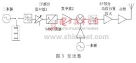 脈沖的擴展:165MHz的本振脈沖,經(jīng)過開關(guān)截取0.1μs寬度的脈沖,經(jīng)放大?帶通濾波后,得到一個鐘形脈沖,送到SAW擴展器。SAW擴展器的激勵脈沖可以是一個寬度小于8ns的窄脈沖,也可以是一個帶有載波的鐘形脈沖,為了得到較大的功率,在此選用了鐘形脈沖。