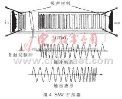 擴展器的原理圖如圖4所示。主要由壓電晶片(這里采用了LiTaO3晶體)和光刻在其表面上的叉指換能器組成。觸發(fā)脈沖輸入換能器后,由逆壓電效應(yīng)激勵出聲表面波。傳播到輸出換能器后,由壓電效應(yīng)轉(zhuǎn)換成與叉指條周期一一對應(yīng)的電磁波。由于聲表面波到達(dá)換能器時間上的差異,得到了一組頻率按線性變化的展寬電脈沖。