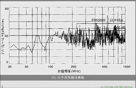 測(cè)試環(huán)境為電波暗室,測(cè)試設(shè)備為寬帶天線、頻譜分析儀和信號(hào)放大器,天線可以在1 m與4 m高度范圍內(nèi)升降,被測(cè)產(chǎn)品放置在一個(gè)可360°旋轉(zhuǎn)的平臺(tái)上,距離天線3 m。測(cè)量時(shí)轉(zhuǎn)動(dòng)平臺(tái),升降天線找到最大干擾,天線測(cè)量取水平和垂直兩種極化。