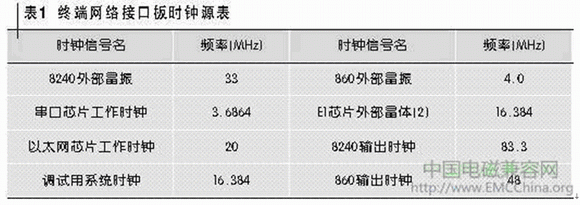 因?yàn)榻K端網(wǎng)絡(luò)接口板上沒(méi)有412.5 MHz和577.5 MHz這兩個(gè)頻率信號(hào),所以懷疑這兩個(gè)頻點(diǎn)可能是某些頻率信號(hào)的諧波分量。高速電路中,時(shí)鐘電流是第一輻射源。筆者對(duì)終端網(wǎng)絡(luò)接口板上的各時(shí)鐘信號(hào)進(jìn)行了統(tǒng)計(jì),如表1所示。