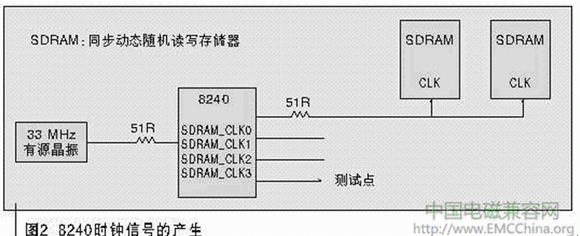 圖2所示為8240時(shí)鐘信號(hào)的產(chǎn)生原理圖。8240外部有源晶振產(chǎn)生33 MHz的振蕩頻率,送入8240芯片,經(jīng)內(nèi)部PLL(鎖相環(huán))鎖相倍頻,輸出83.3 MHz頻率,作為SDRAM(同步動(dòng)態(tài)隨機(jī)讀寫存儲(chǔ)器)的工作時(shí)鐘,8240有4個(gè)引腳可以同時(shí)送出該83.3 MHz的時(shí)鐘:SDRAM_CLK0~SDRAM_CLK3,而且可以在8240內(nèi)部寄存器中設(shè)置開關(guān)。該單板在電路設(shè)計(jì)時(shí),使用SDRAM_CLK0作為SDRAM工作時(shí)鐘,另一路SDRAM_CLK3送至一測(cè)試點(diǎn),方便調(diào)試時(shí)測(cè)量時(shí)鐘信號(hào),其余2路設(shè)置為關(guān)閉狀態(tài),不對(duì)外輸出時(shí)鐘。