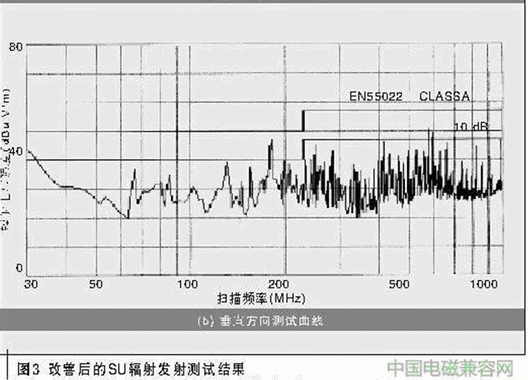 筆者用高速示波器測(cè)量出網(wǎng)絡(luò)接口板的工作地噪聲(Vp-p)為96 mV,中頻板工作后,噪聲增至130 mV以上。此測(cè)量方法可能存在偏差,但總體的趨勢(shì)是2塊單板同時(shí)工作后,的確增加了地線噪聲,對(duì)EMI有一定的影響,只不過(guò)影響是有限的。
