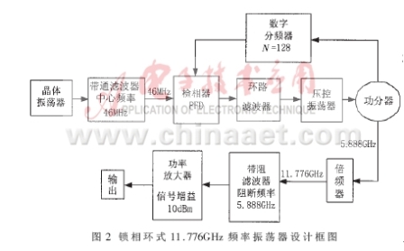 在該頻率振蕩器系統(tǒng)中,利用高穩(wěn)定晶體振蕩源輸出信號經(jīng)過中心頻率為46MHz帶通濾波器,提供一個高精確的穩(wěn)定參考信號至檢相器,鎖相環(huán)路分頻計數(shù)器設(shè)置為128,達到鎖相后VCO輸出5.888GHz固定點頻信號,再經(jīng)過高頻電路倍頻獲得11.776GHz的二次諧波。由于采用的倍頻器基波抑制性能較差,需要通過阻帶濾波和功率放大獲得足夠功率的高穩(wěn)定低相位噪聲的高純度11.776GHz振蕩信號。圖2為整個頻率振蕩器系統(tǒng)的設(shè)計框架。
