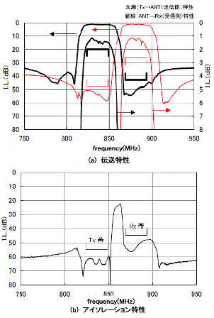 舉例來說,圖1所示的是BAND5(800MHz )收發(fā)雙工器(產(chǎn)品尺寸2.5×2.0×0.6mm)的傳輸特性以及隔離度。一般的隔離度和過濾性的損耗是相互制約的關(guān)系,但本產(chǎn)品對(duì)于Tx頻段能實(shí)現(xiàn)60dB的高隔離度,同時(shí)使Rx損耗維持在1.8dB。