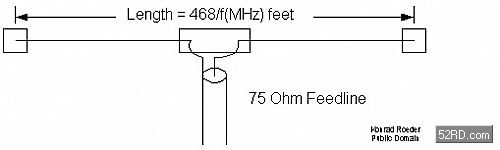 偶極型天線如圖呈T型,T型的水平部分長度為波長的1/2,波長若12.5cm,則T型水平部分長度應(yīng)為6.25cm。