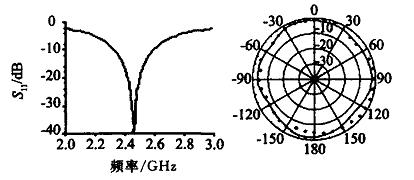 半波偶極子天線模型如圖4a所示.天線采用銅材料(電導(dǎo)率:5.8e7s/m,磁導(dǎo)率:1),位于充滿空氣的立方體中心.在立方體外表面設(shè)定輻射吸收邊界.輸入信號(hào)由天線中心處饋入,也就是RFID芯片的所在位置.對(duì)于2.45GHz的工作頻率其半波長(zhǎng)度約為61mm,設(shè)偶極子天線臂寬w為1mm,且無限薄,由于天線臂寬的影響,要求實(shí)際的半波偶極子天線長(zhǎng)度為57mm.在AnsoftHFSS工具平臺(tái)上,采用有限元算法對(duì)該天線進(jìn)行仿真,獲得的輸入回波損耗S11分布圖如圖5a所示,輻射場(chǎng)E面(即最大輻射方向和電場(chǎng)矢量所在的平面)方向圖如圖5b所示.天線輸入阻抗約為72Ω,電壓駐波比(VSWR)小于2.0時(shí)的阻抗帶寬為14.3%,天線增益為1.8.