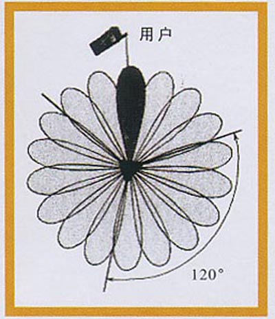 (1)波束轉(zhuǎn)換智能天線波束轉(zhuǎn)換智能天線具有有限數(shù)目的、固定的、預定義的方向圖,它利用多個并行窄波束(15°~30°水平波束寬度)覆蓋整個用戶區(qū),每個波束的指向是固定的,波束寬度也隨天線元的數(shù)目而確定(見圖2)。波束轉(zhuǎn)換系統(tǒng)實現(xiàn)比較經(jīng)濟,與自適應天線相比結構簡單,無需迭代,響應快、魯棒性好。但預先設計好的工作模式有限,窄波束的特性將極大地影響系統(tǒng)性能。