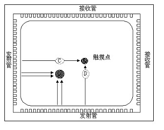 當有觸摸時,手指或其它物就會擋住經(jīng)過該位置的橫豎紅外線,觸摸屏掃描時發(fā)現(xiàn)并確信有一條紅外線受阻后,紅燈亮,表示有紅外線受阻,可能有觸摸,同時立刻換到另一坐標再掃描,如果再發(fā)現(xiàn)另外一軸也有一條紅外線受阻,黃燈亮,表示發(fā)現(xiàn)觸摸,并將兩個發(fā)現(xiàn)阻隔的紅外對管位置報告給主機,經(jīng)過計算判斷出觸摸點在屏幕的位置。