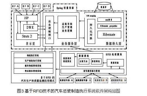 本系統(tǒng)采用B/S架構(gòu),在J2EE開發(fā)環(huán)境下,結(jié)合Struts2、Hibernate、Spring、DWR等主流開源框架,具有良好的跨平臺兼容性。基于RFID技術(shù)的汽車總裝管理系統(tǒng)的軟件架構(gòu)如圖3所示: