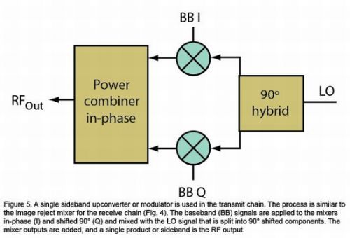 至于上變頻,我們有SSB混頻器或I/Q調(diào)制器。在SSB IRM中,鏡像和有效輸出現(xiàn)在是這種拓?fù)浣Y(jié)構(gòu)中的輸入,RFIn是RFOut。圖5通過(guò)BB(基帶)輸入頻率或發(fā)射通路中的IF信號(hào)簡(jiǎn)化了這種配置。式 15-21顯示這種SSB或I/Q調(diào)制器如何抑制或減少鏡像。