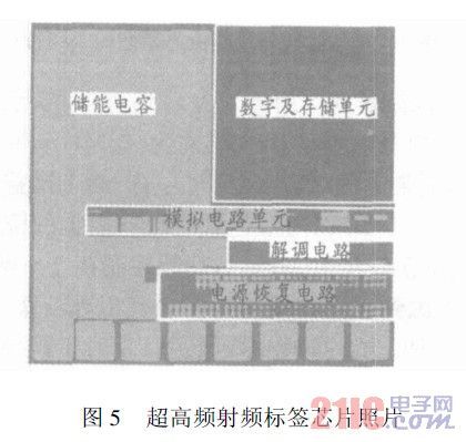 該射頻前端模塊作為超高頻長距離無源射頻標(biāo)簽芯片的一部分,在UMC0.18m混合信號工藝下設(shè)計實(shí)現(xiàn),并流片驗(yàn)證。芯片照片如圖5所示。