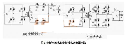 根據(jù)高頻逆變器(推挽式、半橋式、全橋式)、周波變換器(全波式、橋式)的組合不同,高頻脈沖交流環(huán)節(jié)逆變器具有6種電路拓?fù)?,其中全橋全波式、全橋橋式電路如圖2所示。