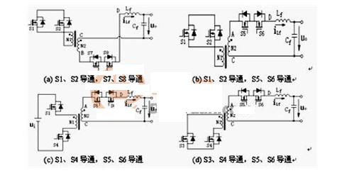讓周波變換器的功率開(kāi)關(guān)S5與S7(S6與S8)之間存在換流重疊導(dǎo)通時(shí)間、S5與S6(S7與S8)按濾波電感電流iLf極性選擇導(dǎo)通,從而使得該控制方案具有如下優(yōu)點(diǎn):1、周波變換器換流重疊期間實(shí)現(xiàn)了變壓器漏感能量的自然換流,實(shí)現(xiàn)了功率器件的零電流開(kāi)關(guān);2、實(shí)現(xiàn)了濾波電感電流的自然續(xù)流;3、iLf極性選擇信號(hào)的引入避免了換流重疊期間周波變換器中的環(huán)流現(xiàn)象;4、每個(gè)開(kāi)關(guān)周期內(nèi)兩次交流側(cè)的能量回饋實(shí)現(xiàn)了逆變橋所有功率器件的零電壓開(kāi)通[5]。