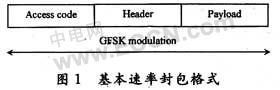 藍(lán)牙v1.2基帶數(shù)據(jù)封包中包含了存取碼、標(biāo)頭、保護(hù)時(shí)段(guard band)和負(fù)載(payload),如圖1所示?;舅俾收{(diào)變指的是GFSK,數(shù)據(jù)會(huì)以每個(gè)符號(hào)攜帶一個(gè)位元的方式,在1 Mb/s的資料速率下進(jìn)行傳輸,因此符號(hào)速率為1 Ms/s。資料會(huì)利用最小115 kHz的載波頻率中的位移或偏差,在RF載波上調(diào)變。高斯脈沖波形將-20 dB的頻寬維持1 MHz,頻譜利用率比BFSK高一倍。