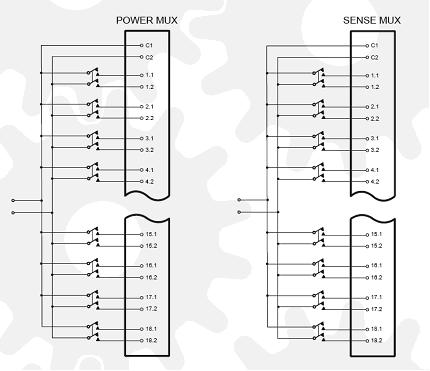 電源和手機(jī)之間的距離一般為幾米,因此就會很難將手機(jī)中的電池的性能很好地發(fā)揮。采用配有遙感接口的快速反應(yīng)電源就可以解決這個問題,該遙感即可調(diào)節(jié)的是手機(jī)上的電壓,而不是電源的輸出端的電壓。需要四根線路來實現(xiàn)這個功能,兩條電源連接線,兩條傳感連接線。這些連接線需要能夠相互轉(zhuǎn)換,這樣就可以將它們同選定的手機(jī)進(jìn)行連接。這些多路復(fù)用器中的兩個可以用來轉(zhuǎn)換36個手機(jī)中的信號。在電源的兩端進(jìn)行電源切換,這樣就可以保證電纜的故障不會造成地面電流流向測試系統(tǒng)。