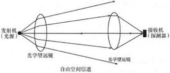一個光無線通信系統(tǒng)構(gòu)成如圖1所示,包括三個部分:發(fā)射機、信道和接收機。光發(fā)射機的光源受到電信號的調(diào)制,并通過作為天線的光學(xué)望遠鏡,將光信號經(jīng)過空間送到接收端的望遠鏡。高靈敏度的光接收機,將望遠鏡收到的光信號再轉(zhuǎn)換成電信號,值得注意的是,發(fā)送端和接收端之間,必須是互相視線可見的,兩終端之間不能有阻擋。由于大氣空間對不同光波長信號的透過率有較大的差別,可以選用透過率較好的波段窗口。光無線系統(tǒng)通常使用0.85μm或1.5μm紅外波段。0.85μm的設(shè)備相對便宜,一般應(yīng)用在傳輸距離不太遠的場合。1.5μm的設(shè)備價格要高一些,但在功率、傳輸距離和視覺安全方面有更好的表現(xiàn)。 1.5μm的紅外光波大部分都被角膜吸收,照射不到視網(wǎng)膜,因此,相關(guān)安全規(guī)定允許1.5μm波長設(shè)備的功率可以比0.85μm的設(shè)備高2個等級,1.5μm波長的光無線通信具有更廣闊的使用前景。