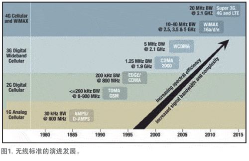 為了解決這一問題,無(wú)線提供商轉(zhuǎn)而采用了可提高頻譜效率的無(wú)線標(biāo)準(zhǔn)。這類似于將多輛駛往同一目的地的轎車碼放在一輛卡車上,并將卡車沿著高速公路開往目的地。這種方法使相同的高速公路上可以實(shí)現(xiàn)更多的數(shù)據(jù)傳輸流量,而不會(huì)導(dǎo)致流量降低。為了提高頻譜效率,我們可部署或定義所有的無(wú)線標(biāo)準(zhǔn),其中包括CDMA2000、W-CDMA、TD-SCDMA、MC-GSM、WiMAX以及LTE等。圖1顯示了近年來(lái)用于提高頻譜效率所部署或定義的無(wú)線標(biāo)準(zhǔn)。