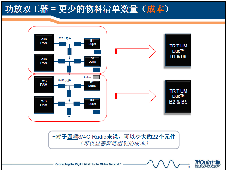 日前,TriQuint推出業(yè)內(nèi)最小針對3G和4G智能手機的雙頻帶功放雙工器(PAD),在單一緊湊模塊中結(jié)合了兩個特定頻帶的功率放大器(PA)和雙工器,有效地替代了多達12個分立器件,在降低物料清單(BOM)成本的同時,通過共同的占位面積簡化設(shè)計、加速整體產(chǎn)品上市時間帶來一系列額外的成本節(jié)省。